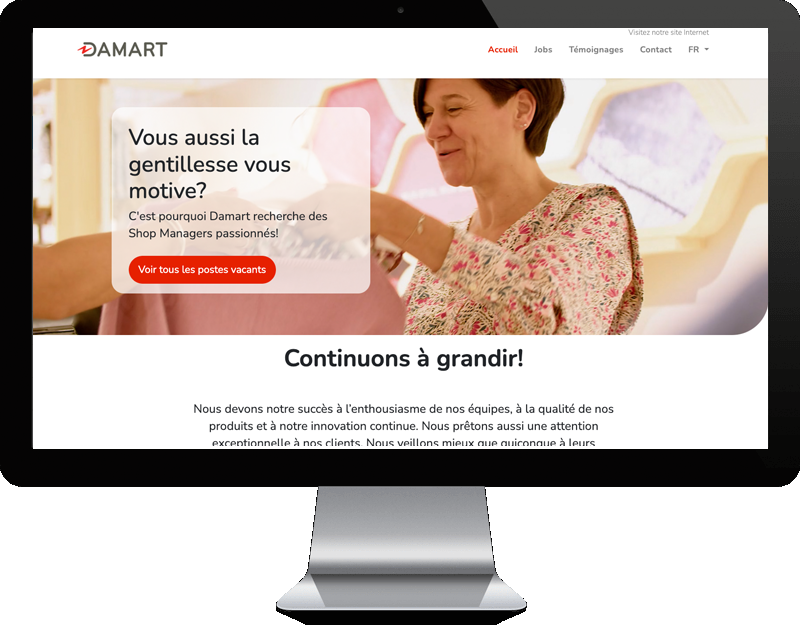 La mise en page du modèle de site carrière est entièrement fixée, ce qui signifie qu'aucune modification ne peut être demandée. Des pages supplémentaires peuvent être ajoutées moyennant l'approbation de notre offre. Si des ajustements supplémentaires sont demandés, ils seront effectués en régie et facturés en conséquence.