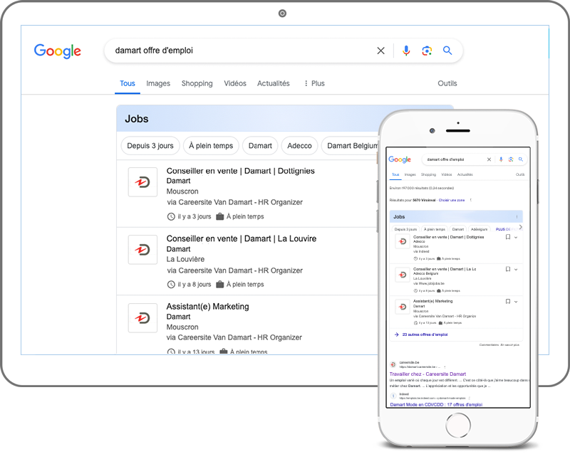 Grâce au module de publication en masse, HR Organizer garantit que vos offres d'emploi apparaissent directement depuis votre ATS dans Google for Jobs. Ce canal devient de plus en plus important et constitue une extension utile de votre afflux. En intégrant HR Organizer à Google for Jobs, vous touchez un public plus large. Vous pouvez créer des publications facilement et rapidement à partir de l'ATS convivial.