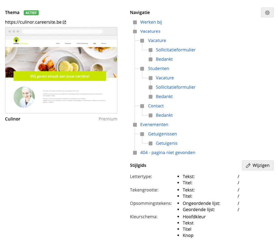 De careersite bevat standaard enkel volgende pagina's: werkenbij - overzicht vacatures - vacature detail- bedanktpagina. Java script programmeren voor sliders of animatie zit niet inbegrepen in het budget. Het logo van HR organizer staat op elke pagina ter aanduiding van de achterliggende connectie met jullie cloudplatform.