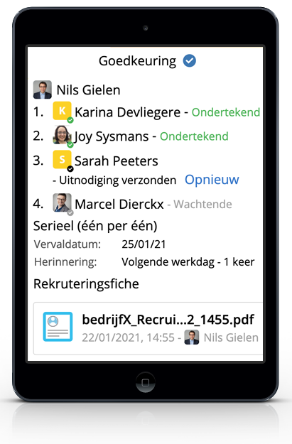 U kan iedere user uitnodigen om deel te nemen aan een goedkeuringsproces. Het proces kan serieel of parallel uitgerold worden. Bij de één per één goedkeuring bepaalt u zelf de volgorde.