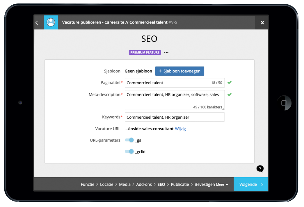 Per vacature kan u keywords, meta-tags, paginatitel en description ingeven.