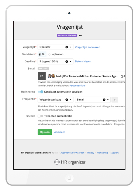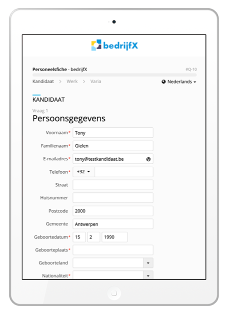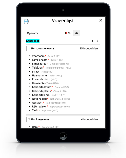 Ter voorbereiding van een "dimona-in" kan u de kandidaat een vragenlijst aanbieden. De kandidaat kan deze online invullen. U kan de personeelsfiche zelf instellen en aangeven welke velden verplicht dienen ingevuld worden.