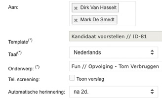 Met een recruitment mail kan u een vacature voorstellen aan kandidaten uit uw wervingsreserve of talentpool. Deze mail kan in bulk naar meerdere kandidaten tegelijk gestuurd worden.